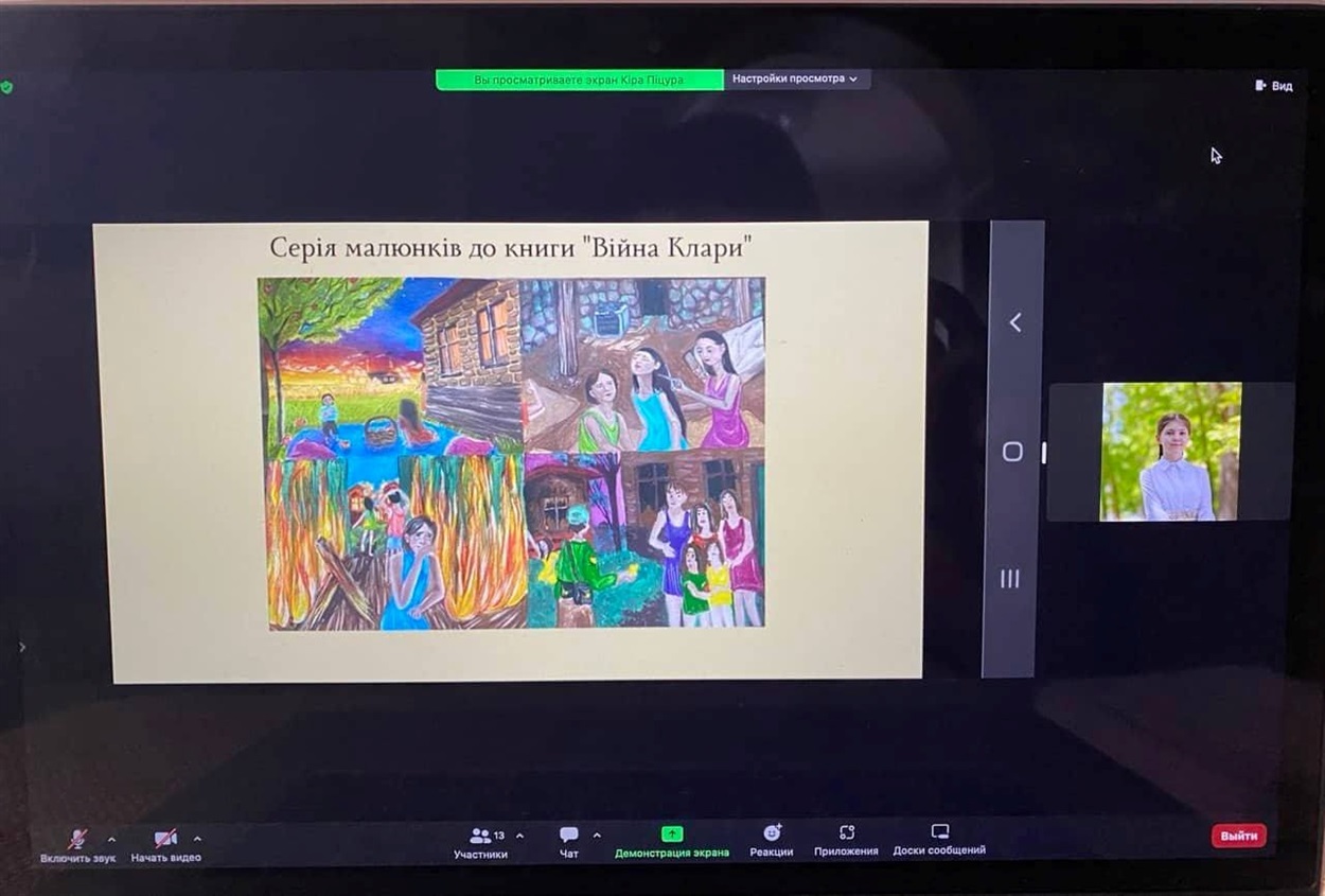 Кіра Піцура учениця 10-Б класу гідно презентувала свою творчу роботу «Життя в бункері»(серія малюнків- ілюстрації до книги «Війна Клари») та стала переможницею конкурсу в номінації «Іллюстрація до книги».