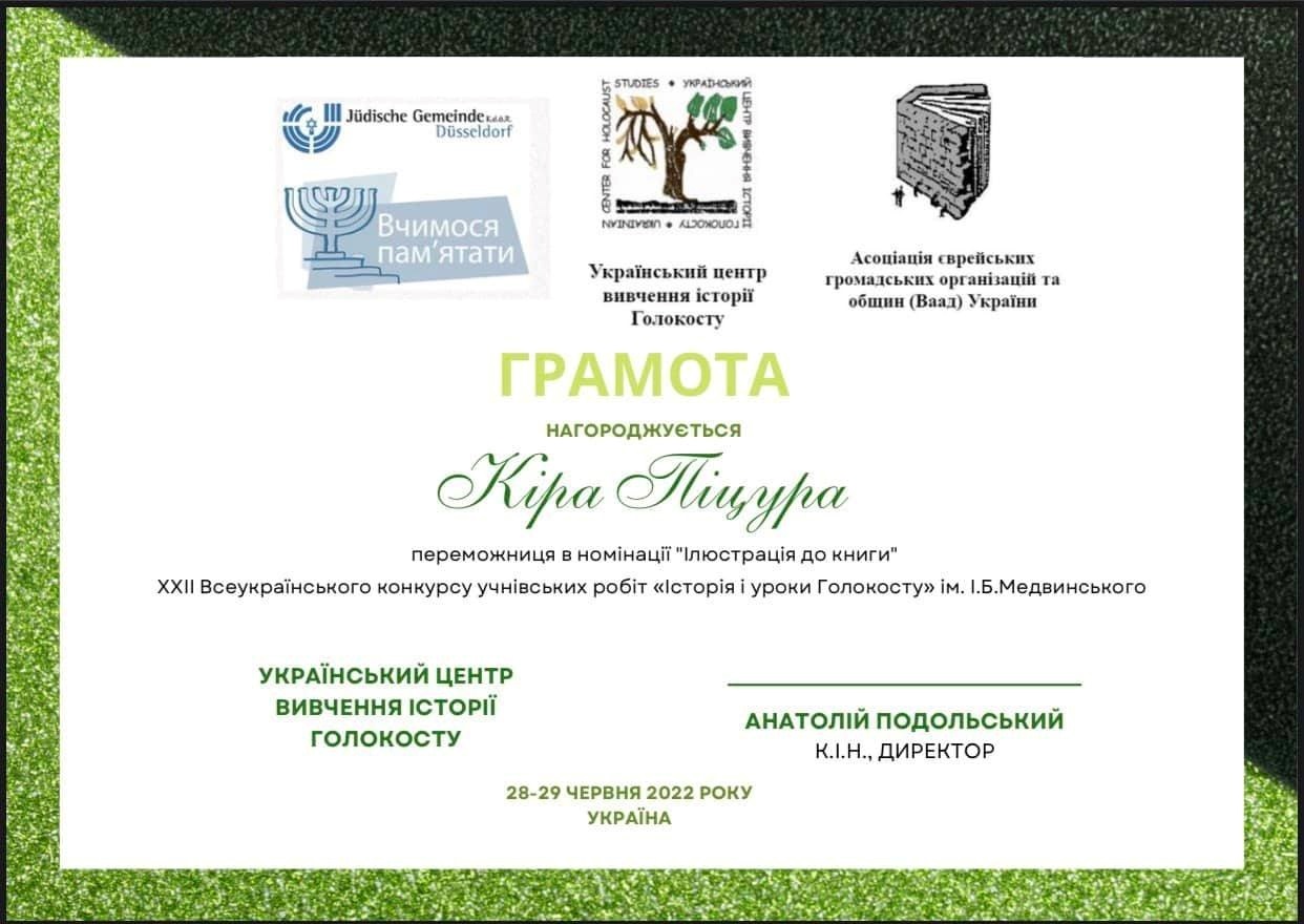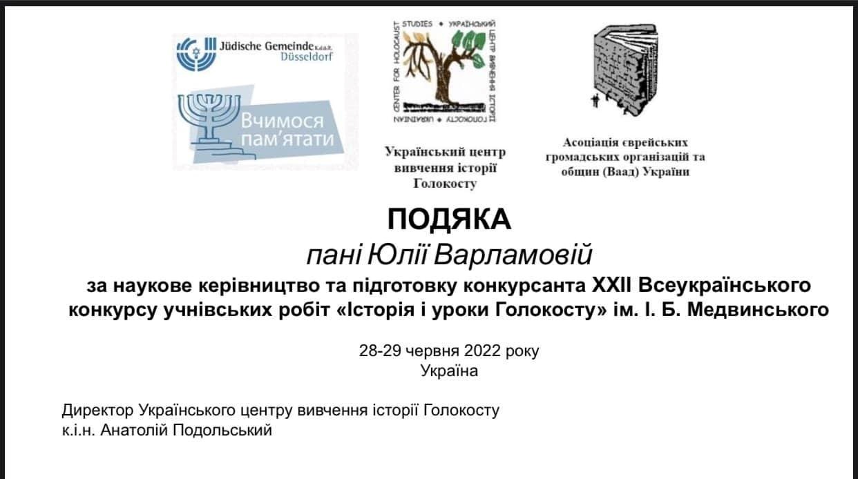 28-29 червня відбувся фінал XXII Всеукраїнського конкурсу учнівських робіт «Історія і уроки Голокосту» ім. І. Б. Медвинського. Другий рік поспіль учениці нашого ліцею беруть у ньому участь. Як відмітив у вітальному слові голова журі Анатолій Подольський, керівник Українського центру вивчення історії Голокосту, цьогорічний конкурс відбувався в тяжких умовах збройного конфлікту, але з надією на майбутнє. Тільки найвідчайдушніші наважилися взяти участь у конкурсі. А ми саме такі...