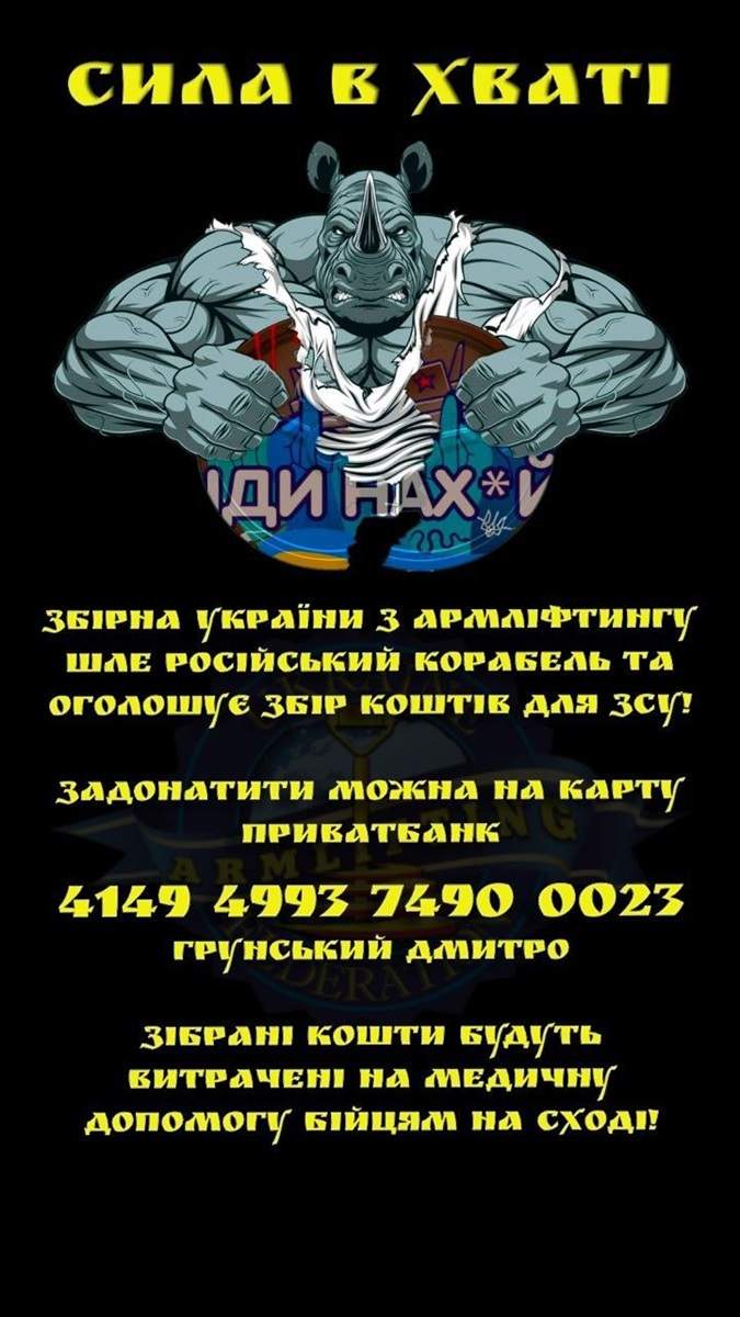 Дмитро Грунський від себе особисто та від федерації армліфтингу висловлює щиру подяку всім хто вніс донат, партнерам заходу belokua.dp та мережі магазинів метизів "Метизний Світ" за надану безкоштовно продукцію для проведення заходу. Та закликає всіх небайдужих долучатися до допомоги ЗСУ для наближення нашої перемоги!