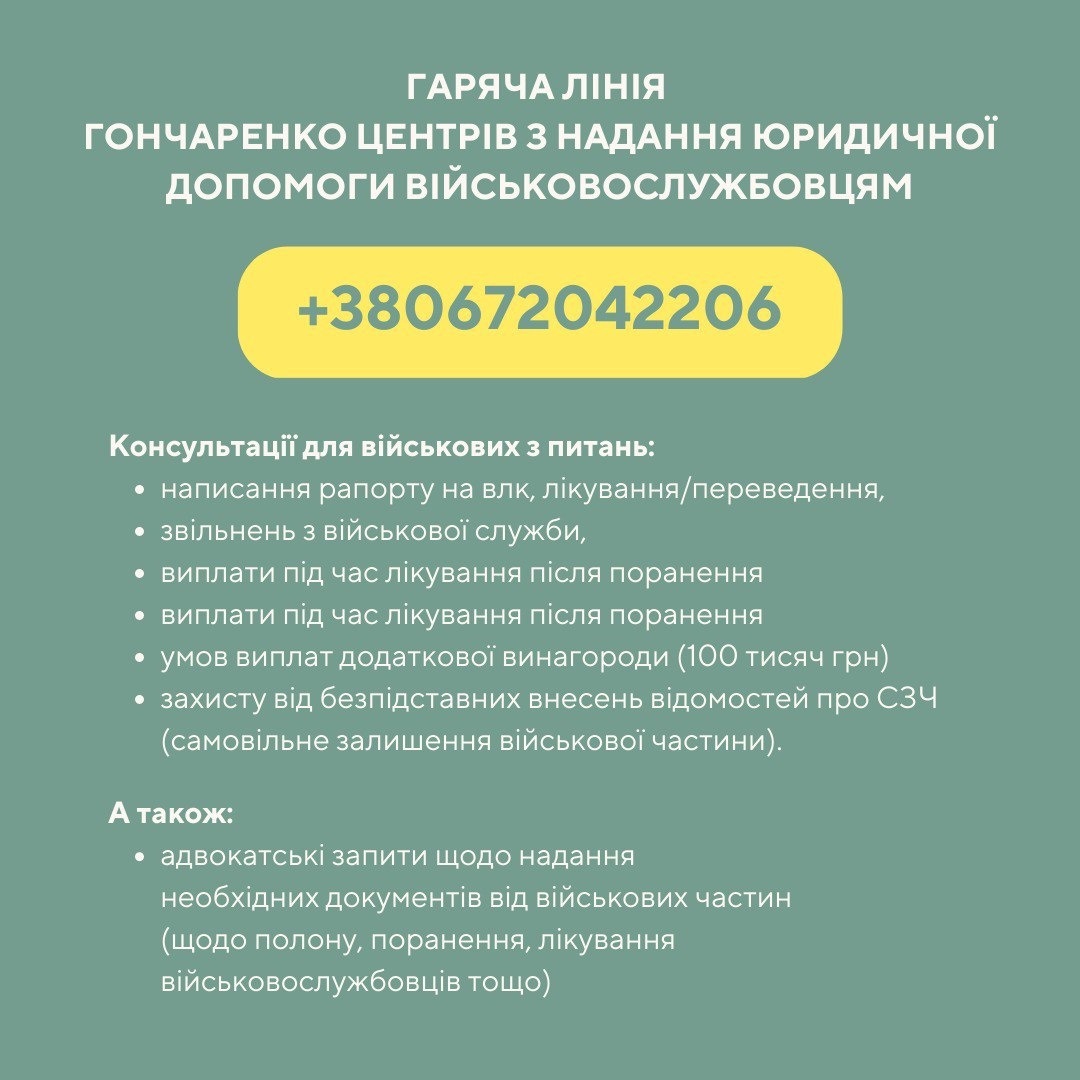 Всеукраїнська мережа Гончаренко центрів відкрила безкоштовну гарячу лінію для юридичної допомоги військовим. Фахівці консультують бійців по актуальних питаннях: від отримання фінансової допомоги та компенсацій до оскарження незаконних дій командування. Звернутися до юристів можна за телефоном, на емейл або через месенджери.