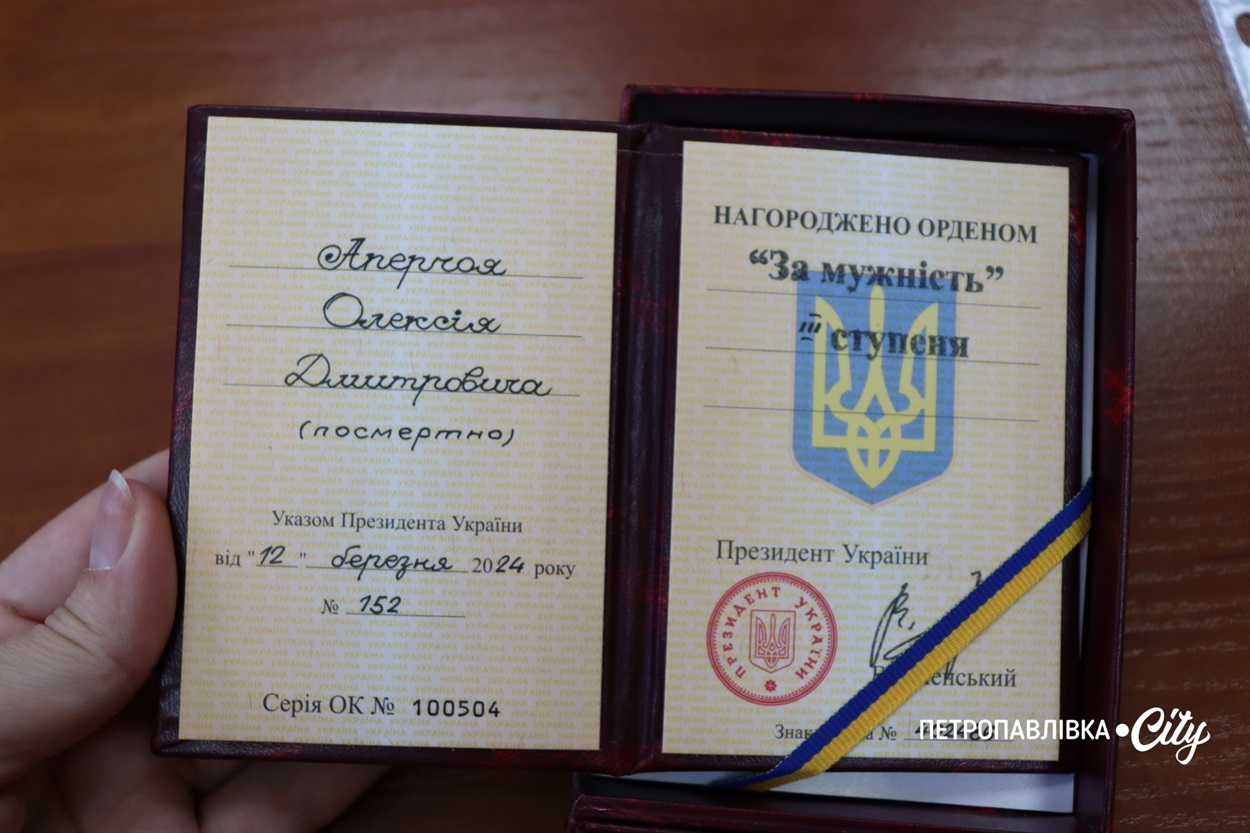 Минуло вже майже 9 місяців, як Аперчой Олексій віддав своє життя захищаючи Україну. Сьогодні він був нагороджений орденом «За мужність» ІІІ ступеню посмертно. Нагороду дружині Лілії вручили Олександр Міщенко, представник Петропавлівського військкомату та Олена Макогон, голова Української громади.