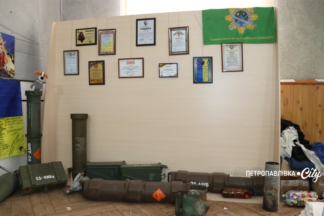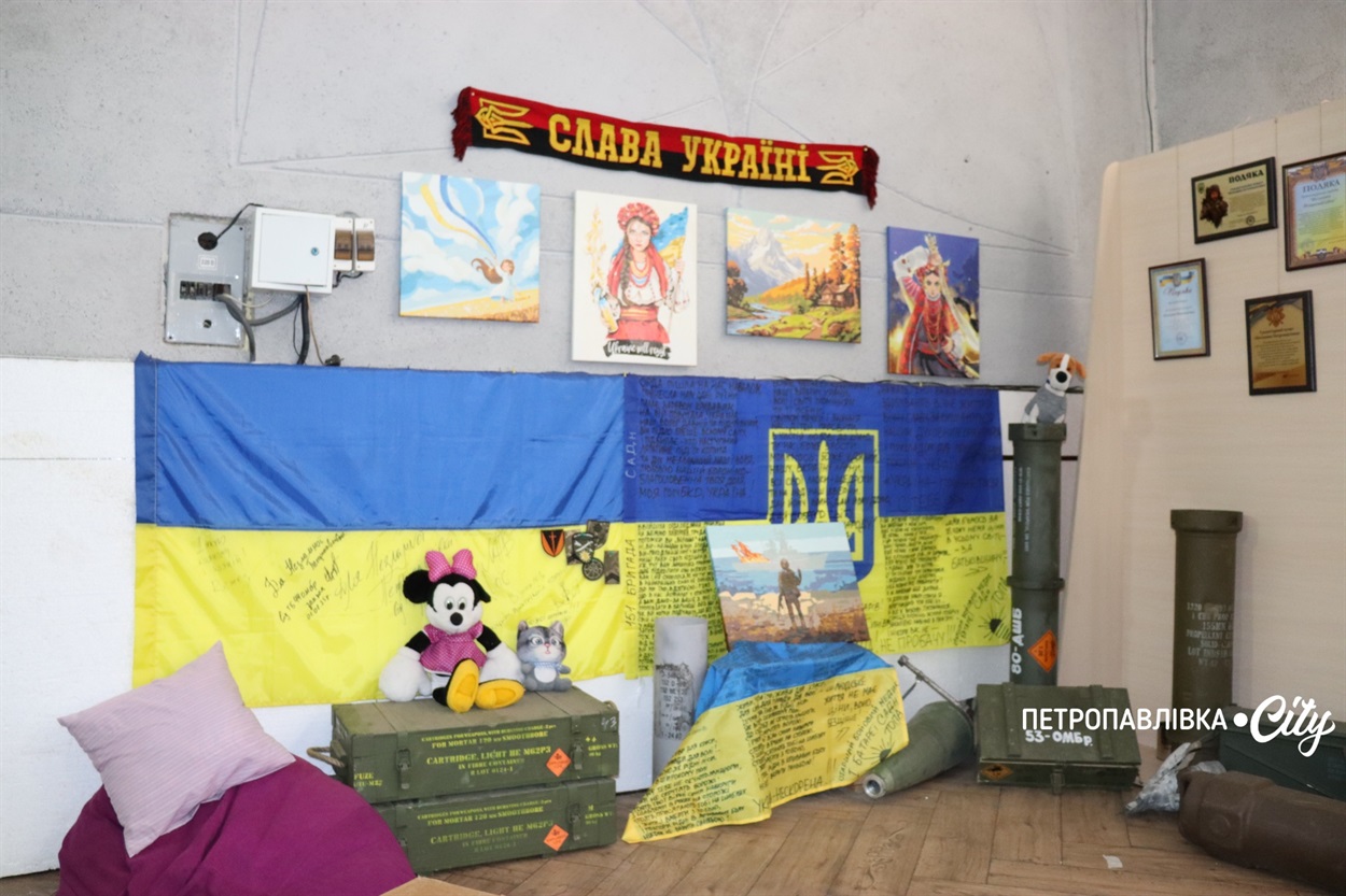 Під стіною стоять порожні гільзи, ящики з-під боєприпасів, які військові передають як символ вдячності. На деяких — стрічки та наліпки з підписами підрозділів. Над ними розгорнуто прапор України, списаний побажаннями, підписами й словами вдячності від захисників. Цей прапор — наче жива книга фронтових історій, кожен рядок якої нагадує: усе, що робиться тут, — не марно.