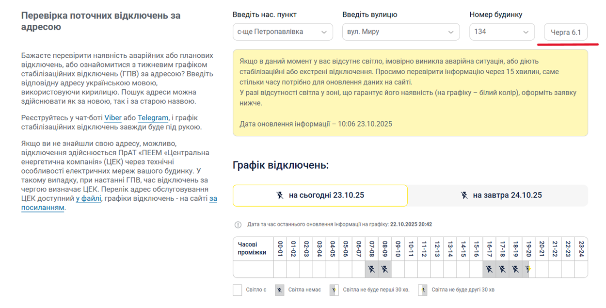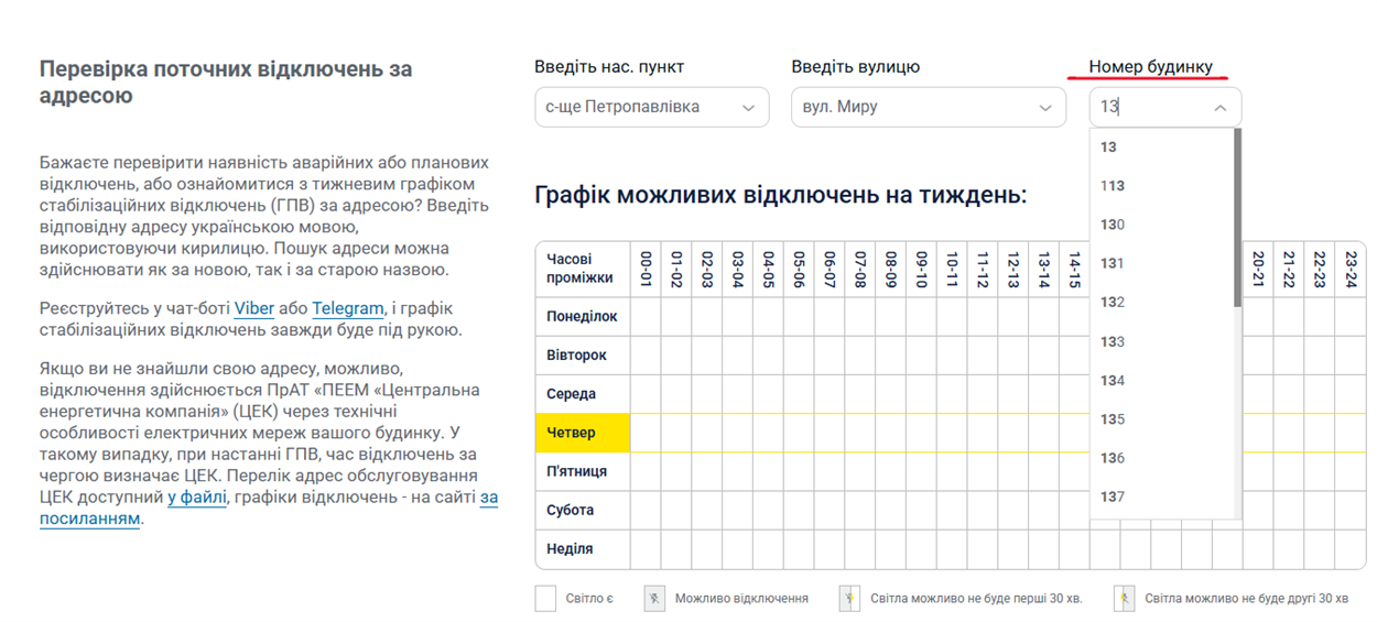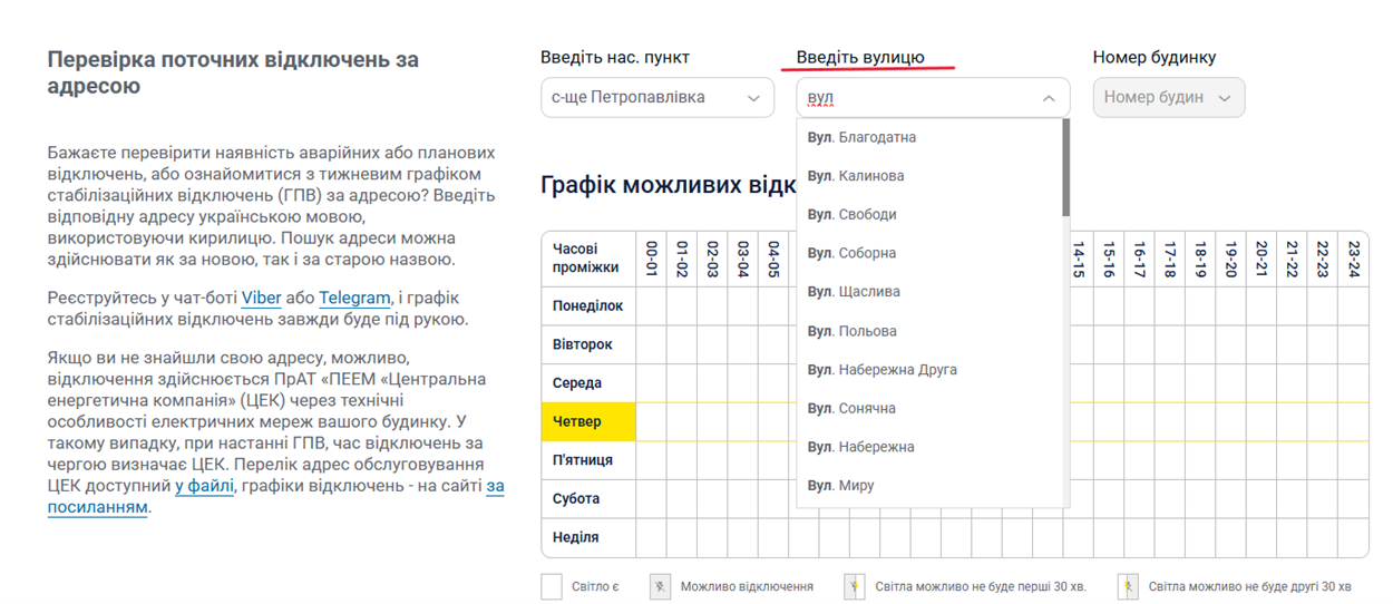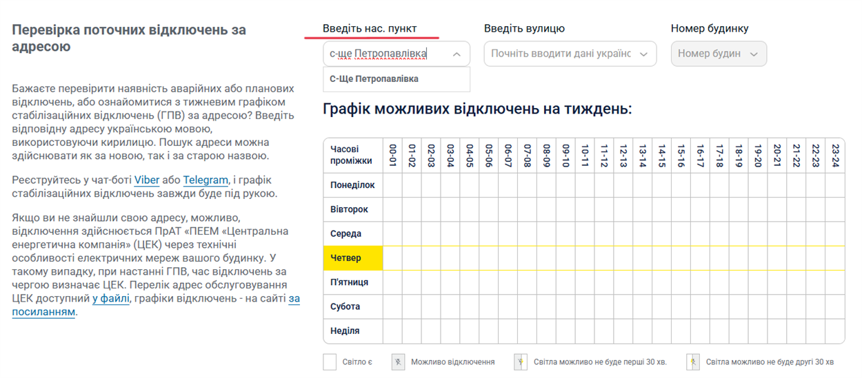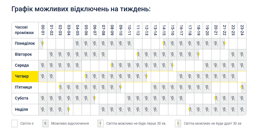 Після того як система визначить вашу групу, нижче з'явиться розклад за днями та годинами, коли можливе відключення світла.