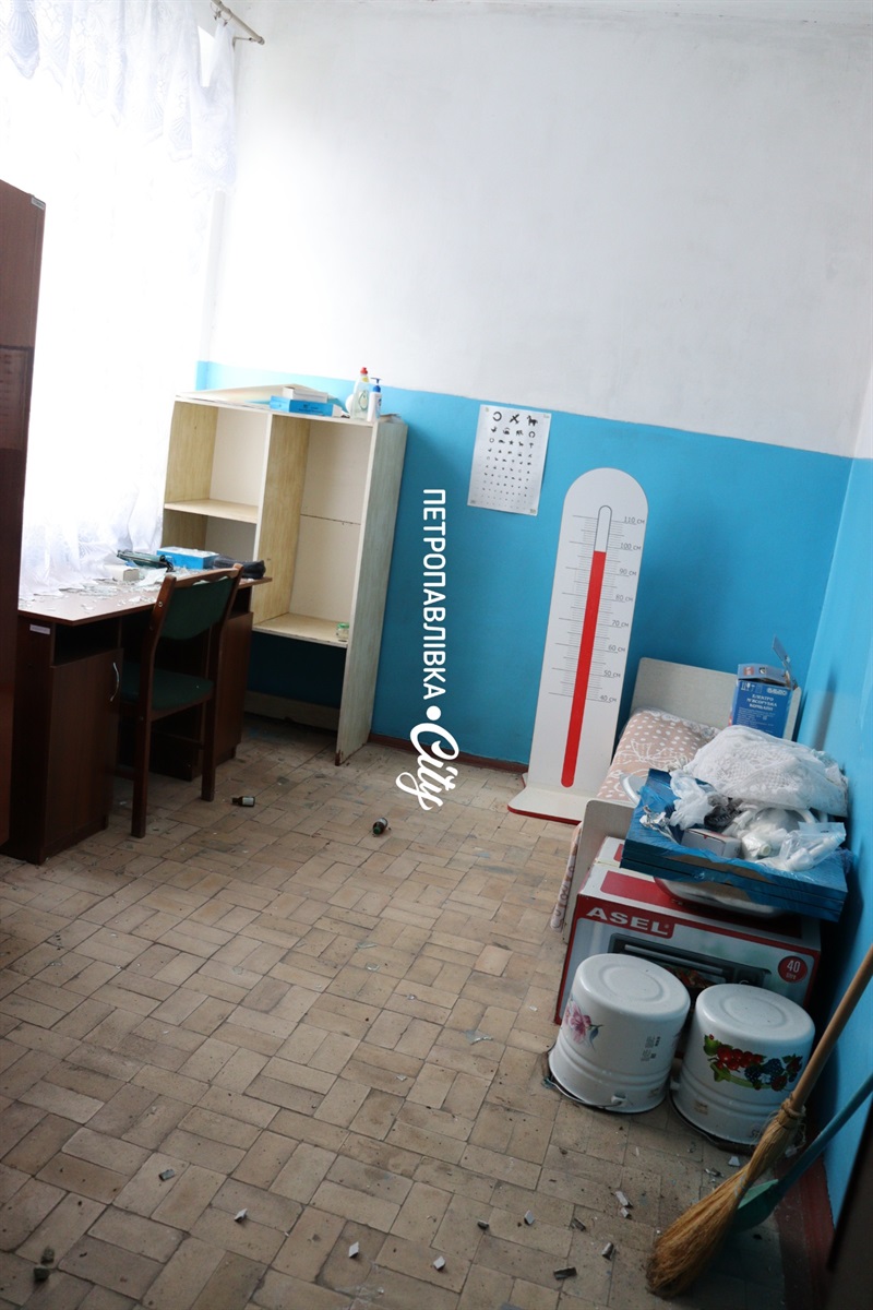 Працівниця медичного пункту розповідає, що вже встигли прибрати бите скло, закривають вікна плівкою та ОСБ, чекають на ремонт техніки.