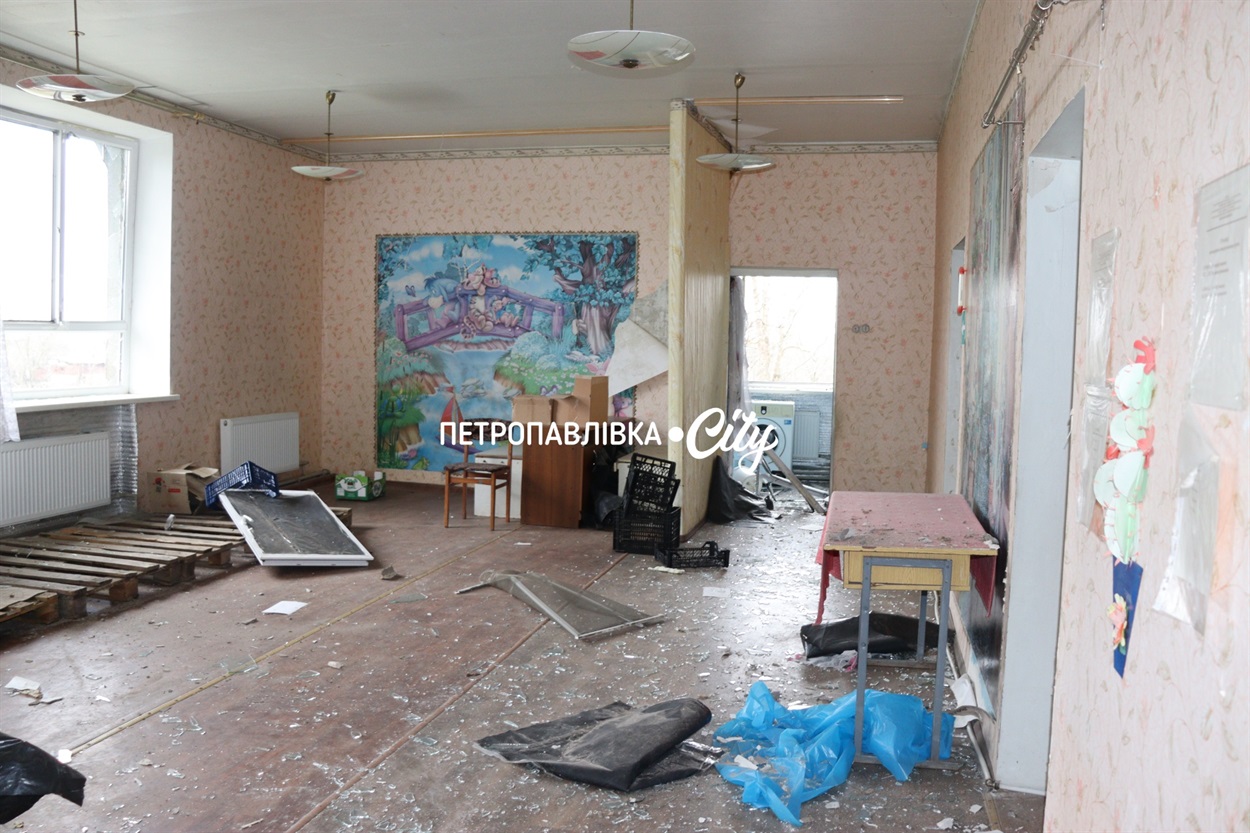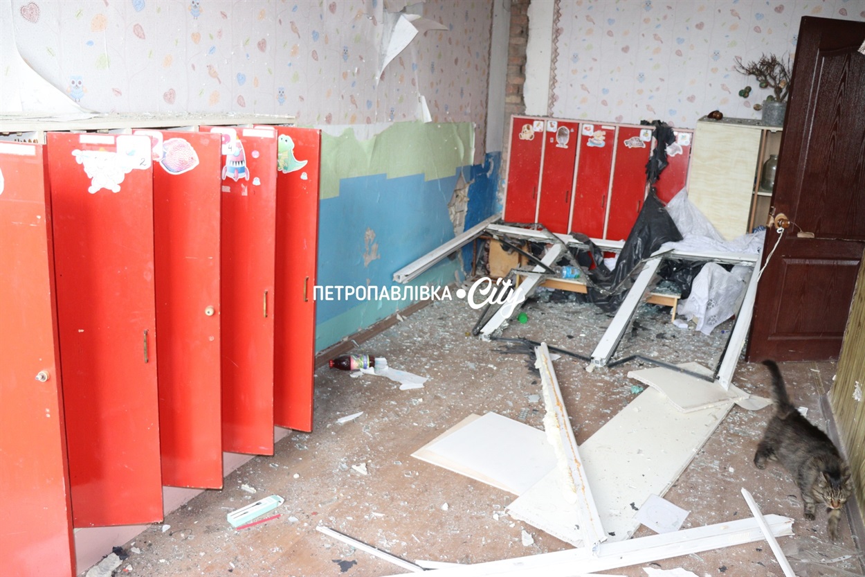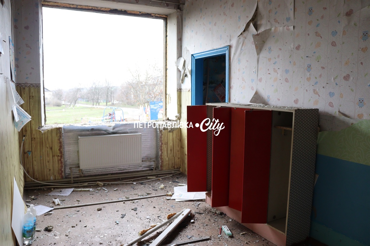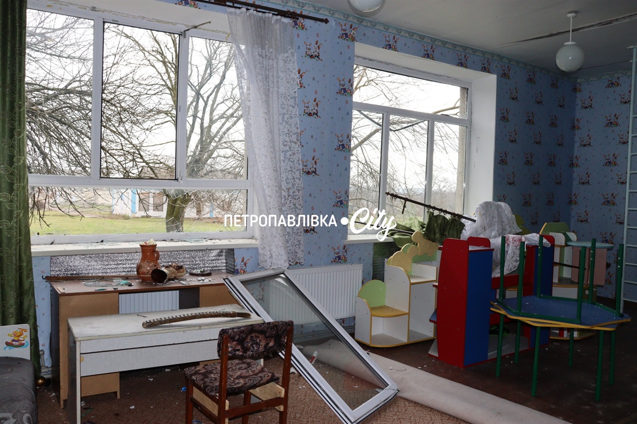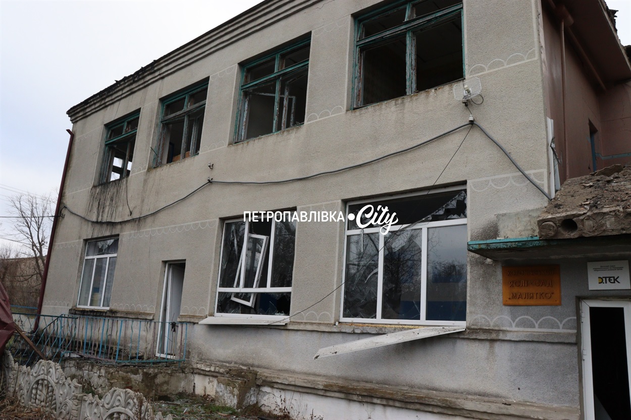 Перший удар припав на територію дитсадка: вибило вікна, зірвало край даху, пошкодило паркан.