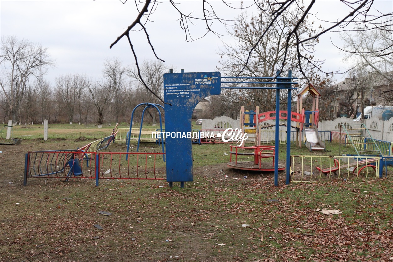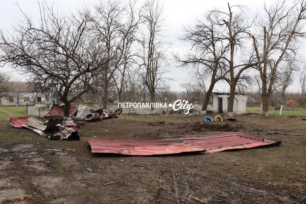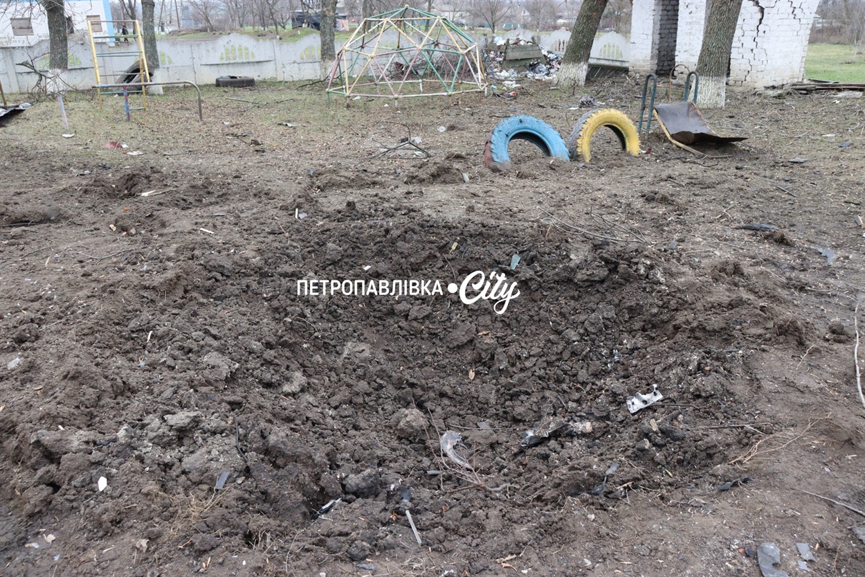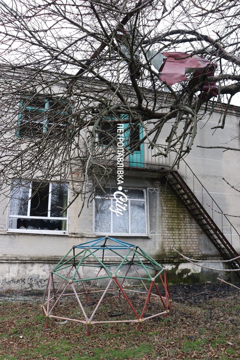 Подвір'я біля садочка усипане рештками покрівлі, а біля дитячого майданчика вирва, що залишилася від улару ворожого безпілотника. Така тепер реальність у прифронтових селах.
