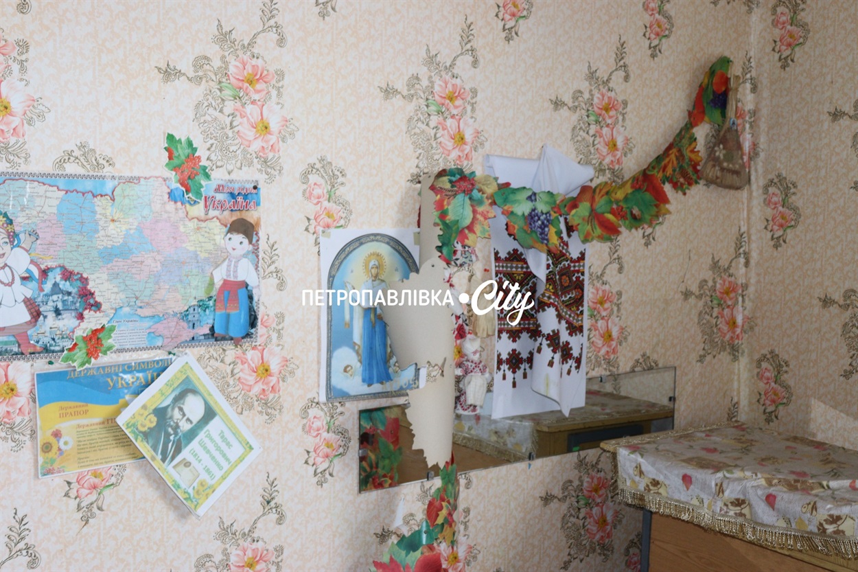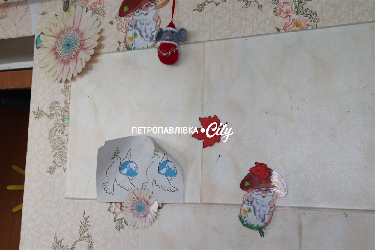 А ще на стінах — дитячі поробки. Колись їх робили маленькі пальчики, старанні, інколи не дуже вмілі. Зараз ці квіточки, сонека — свідки того, що тут було життя, свідки того, як це життя зупинилося одного для від ворожого шахеду.