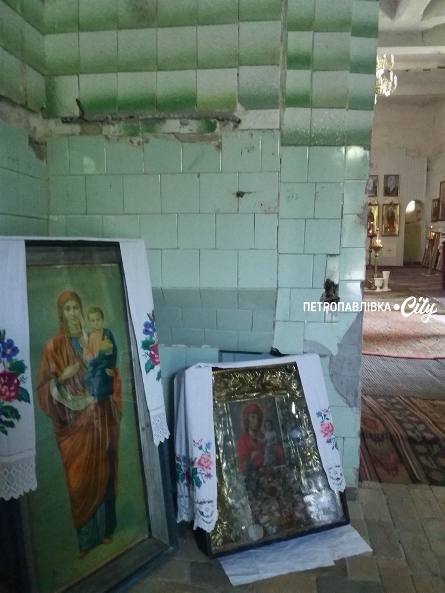 Ікони висять на стінах храму у Новопавлівці, а даху нема. КАБ.