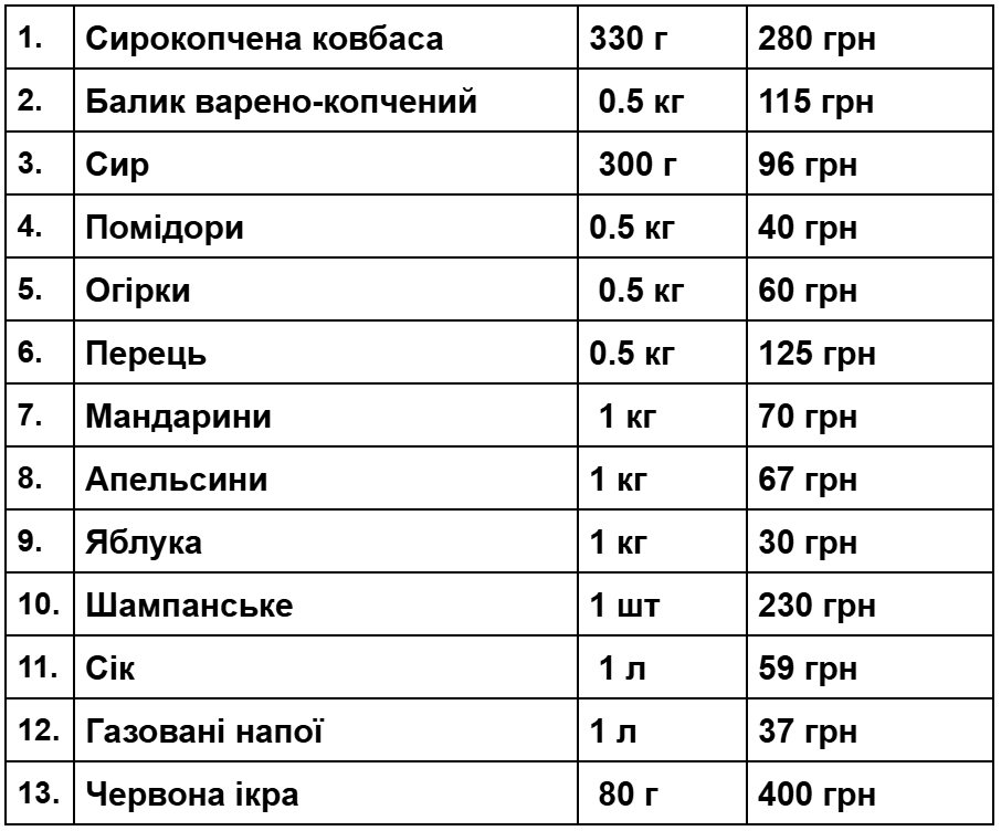 Також ми підрахували стандартний набір продуктів до новорічного столу.