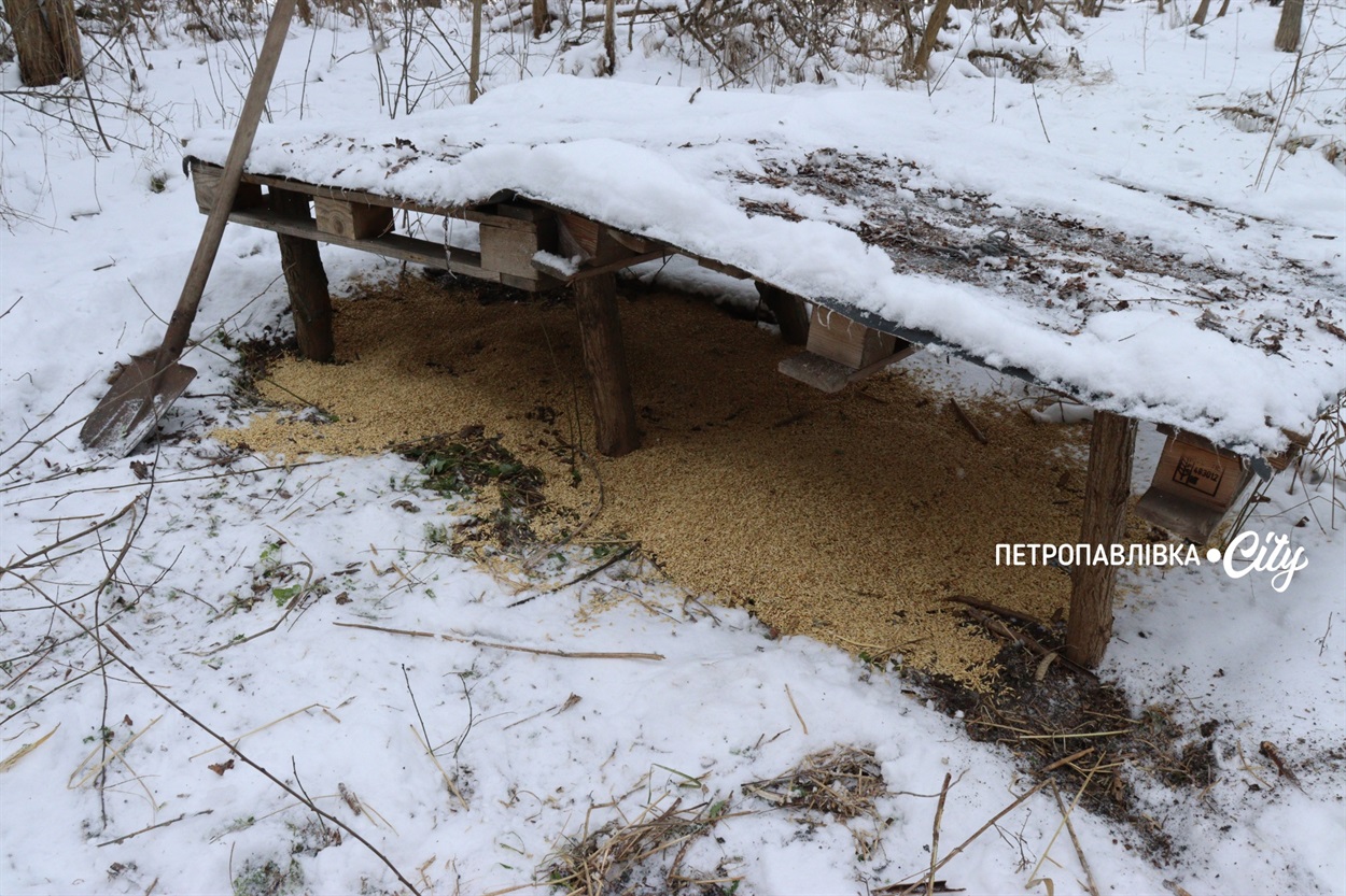 — Це спеціально накритий поміст, аби зерно не засипало снігом і воно не мокло, — пояснює Роман Корнілов. — Приїздимо з підкормкою двічі за зимовий сезон. Цього вистачає, аби птахи й звірі мали чим поживитися протягом зими.