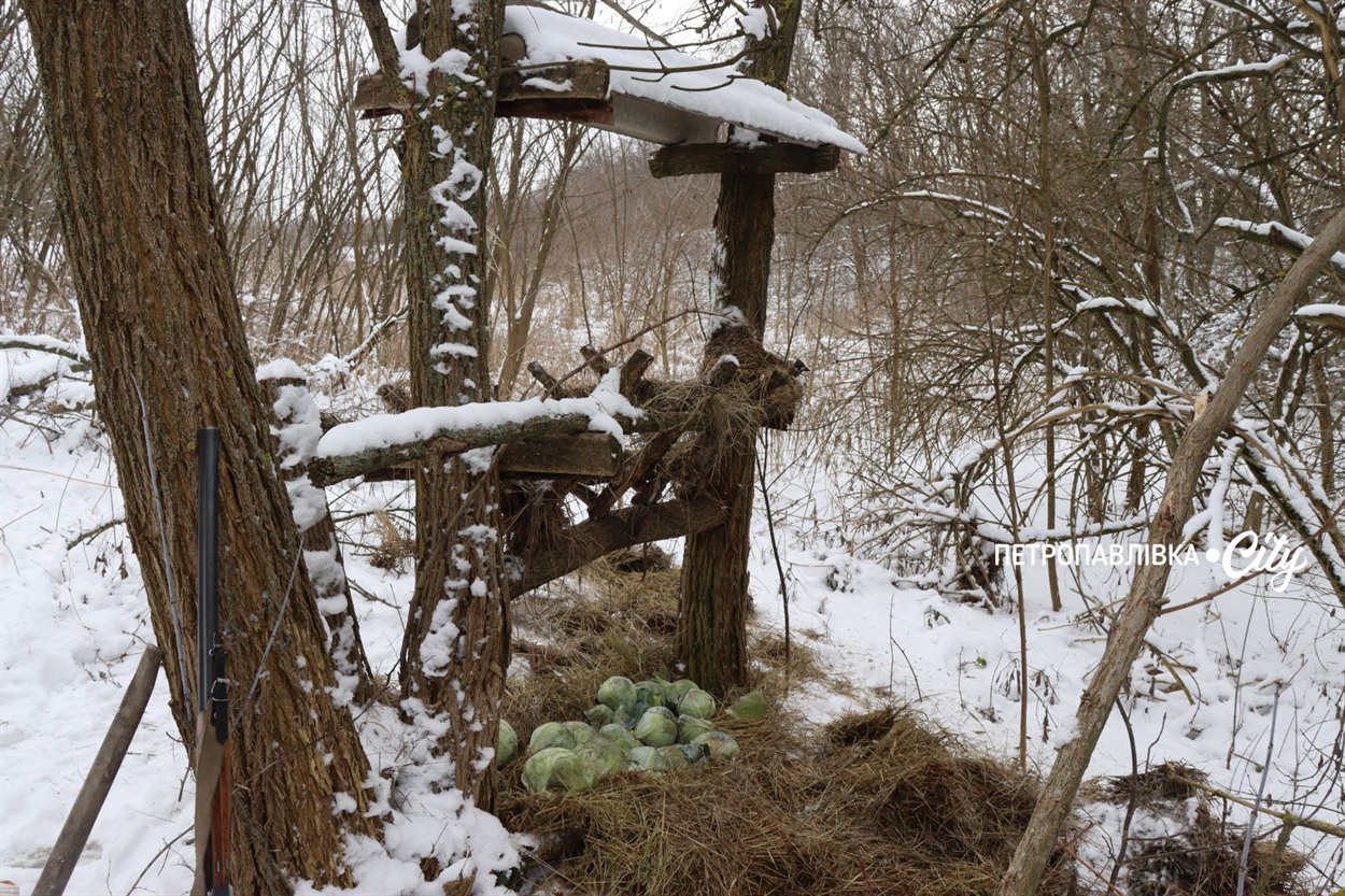 Ми прибули на місце. У лісі на нас чекають дерев’яні годівниці, зроблені мисливцями власноруч. Одна з них — відкрита, сюди розкладають свіже сіно, заготовлене ще з літа. Інша — накрита, під помостом висипають зерно.
