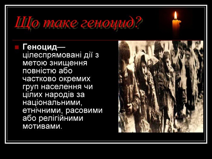 Термін «геноцид» вперше застосував польський правник Рафаель Лемкін для опису злочинів проти різних національностей. Дослівно це слово перекладається як «вбивство раси/роду». У 1948 році ООН кодифікувала геноцид як правопорушення у «Конвенції щодо запобігання і покарання злочинів геноциду».