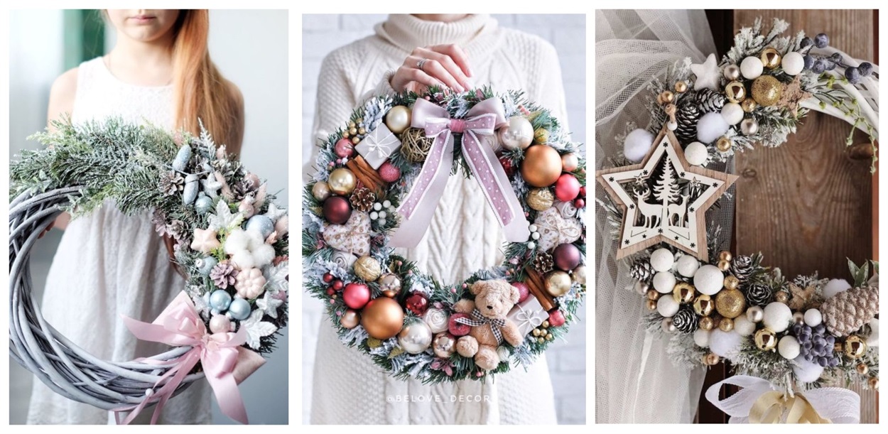 Створіть новорічний вінок на двері з гілок ялини або сосни. Щоб додати до нього яскравості та святковості, використайте: