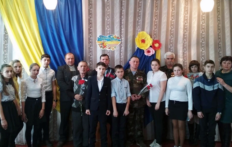 На зустріч до школи завітали гості з Петропавлівки учасники районної спілки воїнів ветеранів-афганців Віктор Лисенко та Олександр Курило.  До них приєдналися місцеві жителі  Юрій Сидоренко та Олександр Селін.