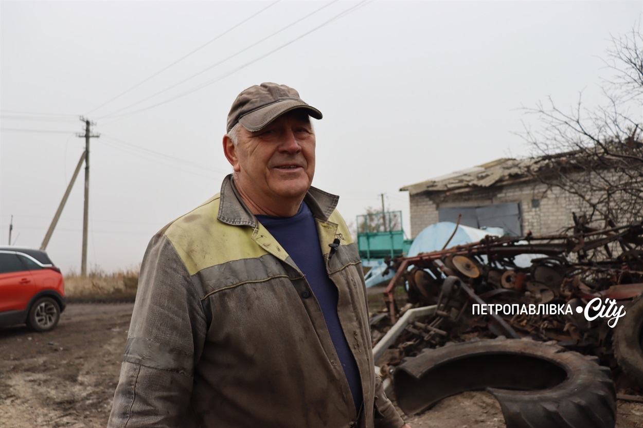 - Це мої сусіди — господарство «Весна», яким керує Пономаренко Віктор Іванович, — говорить Микола Петрович, показуючи на розбиті склади. Бачите, тут ще не вивезене насіння соняшника — усе в перемішку з камінням, це треба переробляти, але очисних машин не вистачає. Комбайн, дякувати Богу, цілий, а от жатку погнуло. Дуже сумно на це все дивитись.