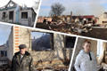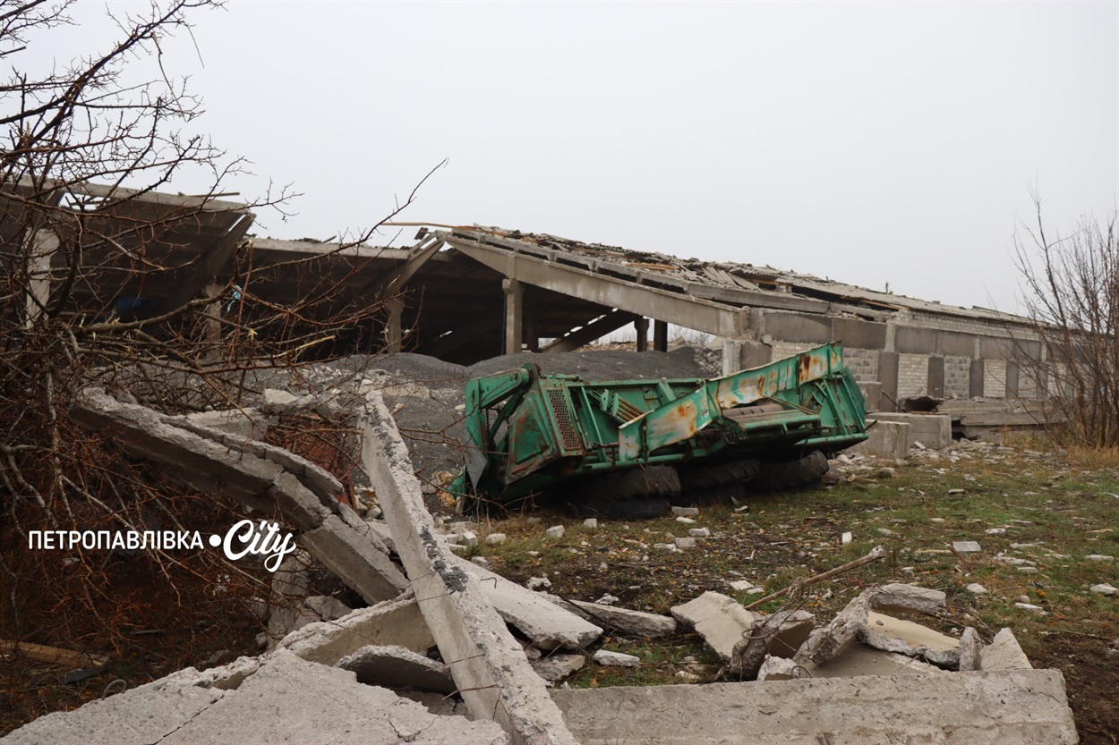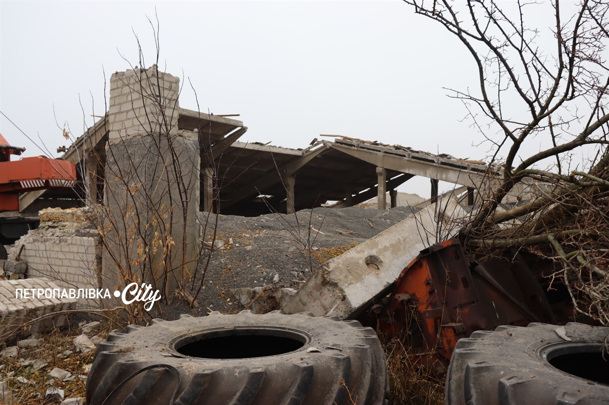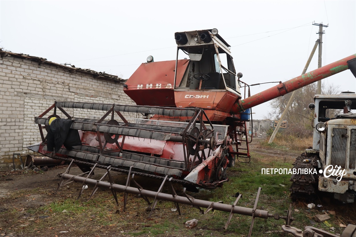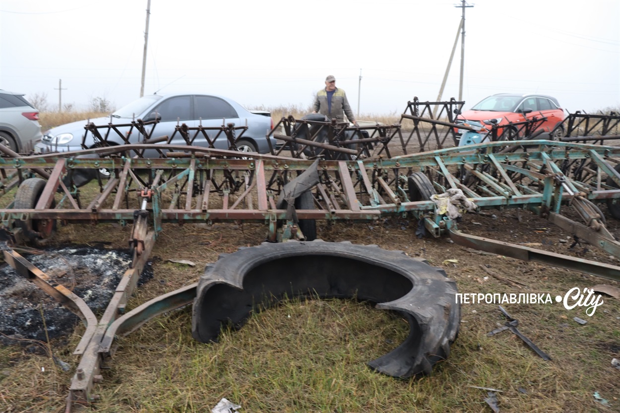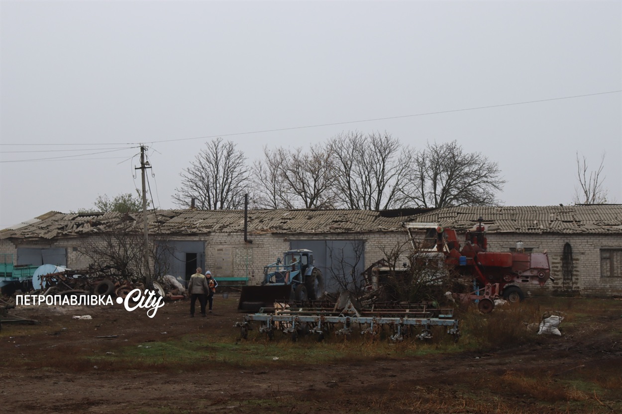 На території залишилися понівечені конструкції складів. Замість сівалки — уламки металу. Комбайн - пронизаний рівними дрібними отворами. Люди розбирають руїни, прибирають залишки.